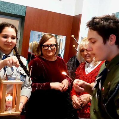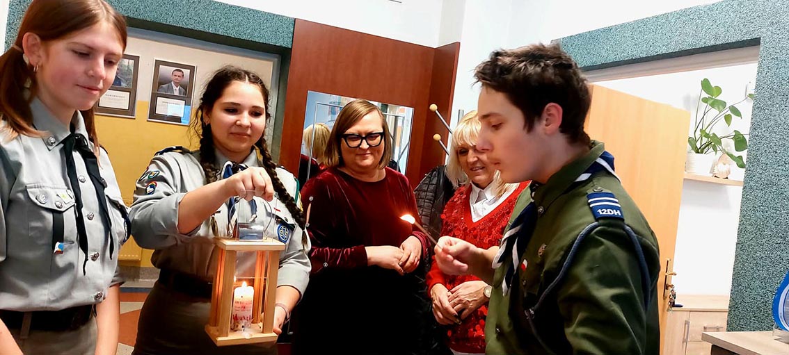 W dniu dzisiejszym naszą społeczność szkolną odwiedzili przedstawiciele Hufca ZHP Lubin, przekazując na ręce Dyrekcji Betlejemskie Światło Pokoju. Ten niewielki płomień, odpalony w Grocie Narodzenia Pańskiego w Betlejem, jest niesiony przez skautów i harcerzy na całym świecie jako symbol nadziei, miłości i pojednania między narodami. Wizyta harcerzy była momentem refleksji nad tegorocznym hasłem akcji: „Pielęgnuj dobro w sobie”. Przesłanie to przypomina nam, że zmiana świata na lepsze zaczyna się od małych gestów, życzliwych słów i wewnętrznej dobroci każdego człowieka. Przyjmując to Światło, nasza szkoła włącza się w wielką sztafetę dobra, która ma na celu niesienie otuchy wszędzie tam, gdzie panuje niepokój. Serdecznie dziękujemy harcerkom i harcerzowi z lubińskiego hufca za kultywowanie tej pięknej tradycji i pamięć o naszej placówce.