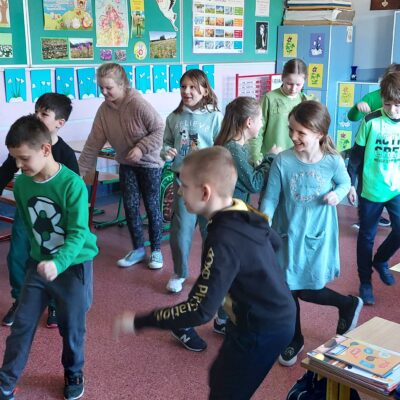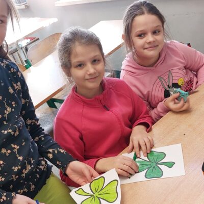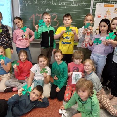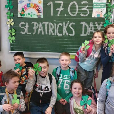 W klasach I-II została przeprowadzona ciekawa lekcja z języka angielskiego nawiązująca do kultury Irlandii. Dzień Świętego Patryka (St. Patrick’s Day) przypada 17 marca na cześć patrona Irlandii – św. Patryka. Za pomocą QR kodów uczniowie zapoznali się z ciekawostkami tego państwa. Kolorowali trójlistną koniczynę (shamrock) oraz spróbowali swoich sił na nauce tradycyjnego tańca irlandzkiego – Irish Jig. Wbrew pozorom nie należy on do najłatwiejszych, o czym przekonali się nasi uczniowie.