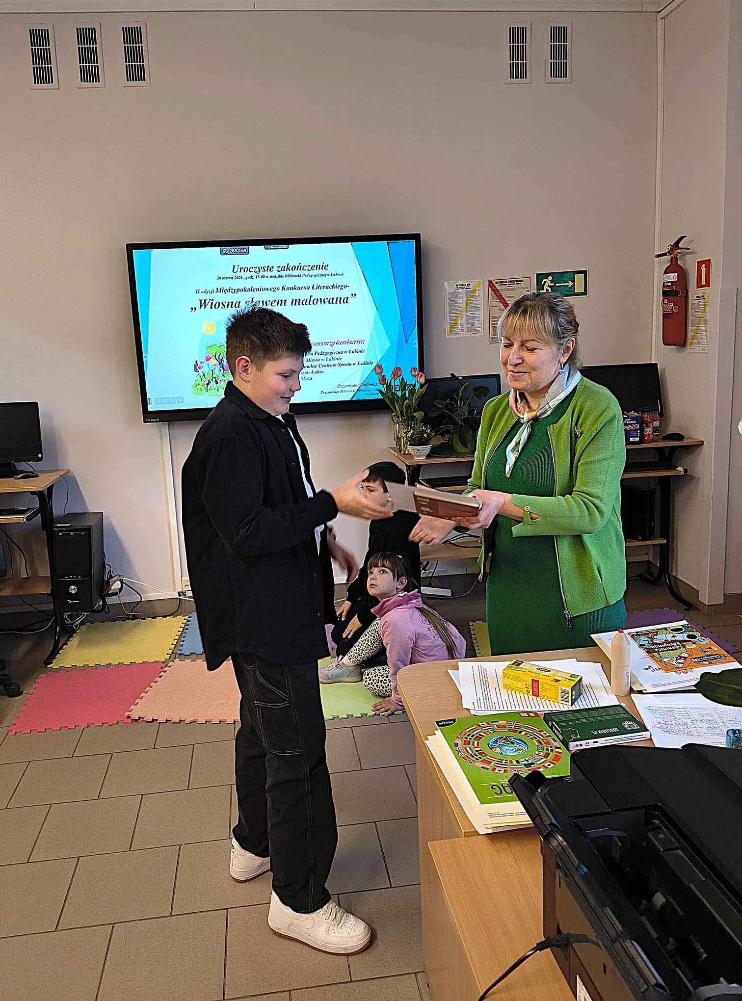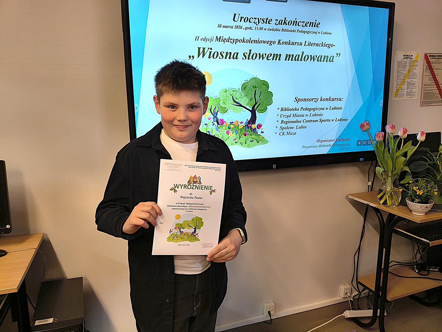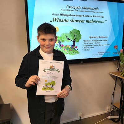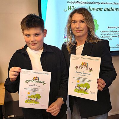 30 marca w Bibliotece Pedagogicznej w Lubinie odbyło się uroczyste wręczenie dyplomów i nagród dla laureatów II edycji Międzypokoleniowego Konkursu Pięknego Czytania i Recytacji „Wiosna słowem malowana”. Z przyjemnością informujemy, że Wojciech Panek z klasy 4a otrzymał wyróżnienie w kategorii klas 4–8, natomiast pani Nina Wojnałowicz – nauczycielka naszej szkoły – zajęła II miejsce w kategorii dorosłych. Gratulujemy pięknych występów, zaangażowania i pasji! Życzymy kolejnych sukcesów i nieustającej radości z obcowania ze słowem!
