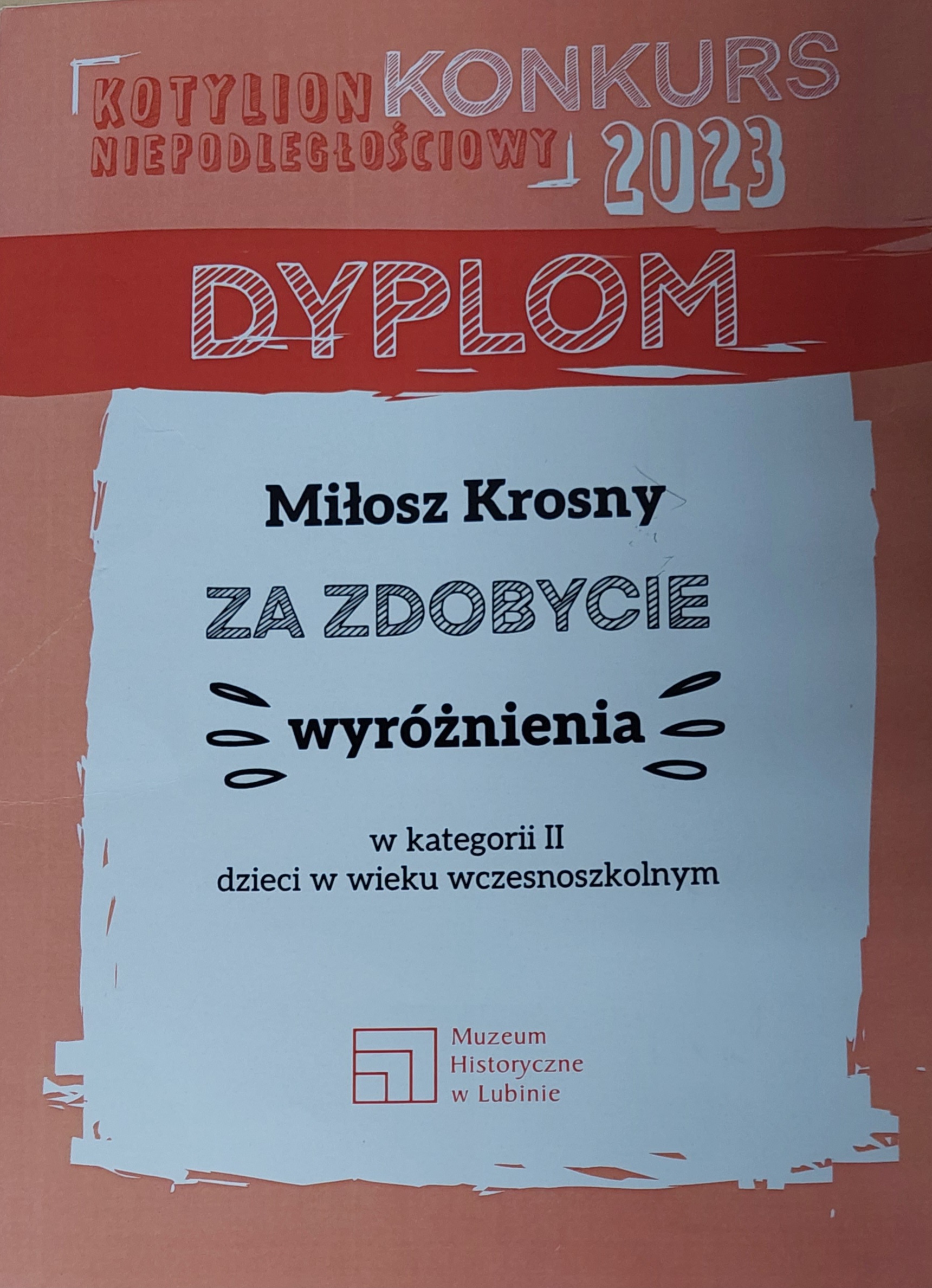 Uczniowie uczęszczający do świetlicy szkolnej wzięli udział w konkursie na najładniejszy kotylion niepodległościowy, organizowanym przez Muzeum Historyczne w Lubinie. Wyróżnienie zdobył Miłosz Krosny. Serdecznie gratulujemy.