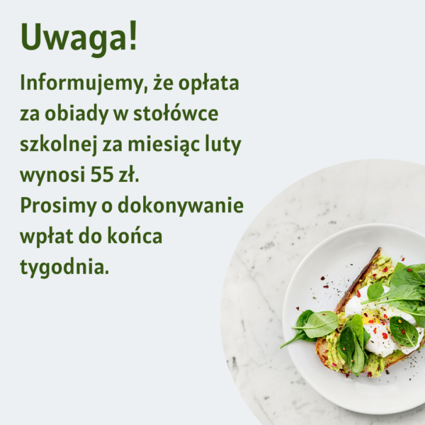 Informujemy, że opłata za obiady w stołówce szkolnej za miesiąc luty wynosi 55 zł. Prosimy o dokonywanie wpłat do końca tygodnia.