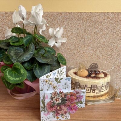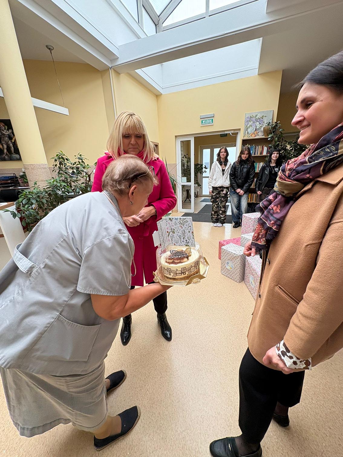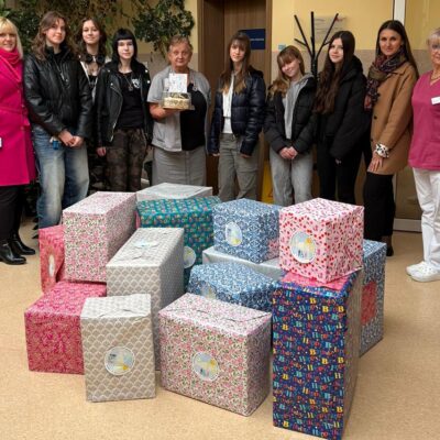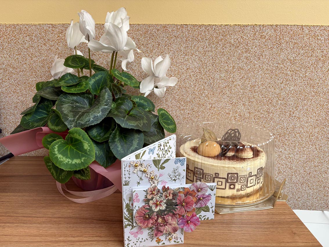 Podczas wizyty przekazaliśmy dary zebrane przez naszą społeczność. Wśród nich znalazł się drobny upominek: tort, który miał za zadanie choć trochę osłodzić codzienność podopiecznym i pracownikom placówki i ręcznie wykonana kartka z życzeniami.