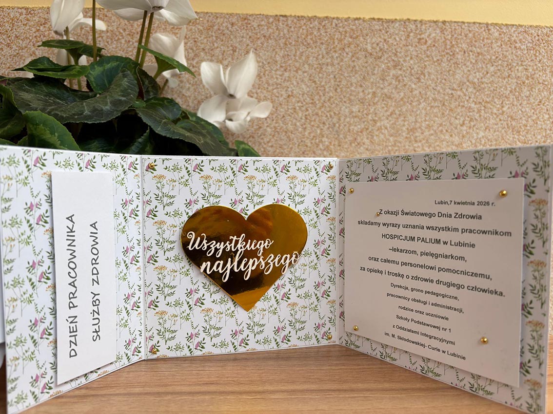 Z okazji Światowego Dnia Zdrowia nasza szkolna społeczność udowodniła, że zdrowie to pojęcie znacznie szersze niż tylko sprawność fizyczna. To także dobrostan ducha, empatia i uważność na drugiego człowieka. Właśnie z taką myślą odwiedziliśmy lokalne hospicjum, prowadzone przez Stowarzyszenie Palium. Chcieliśmy przekazać pacjentom oraz personelowi to, co mamy najcenniejsze – ogrom ciepłych myśli i szczerej radości.