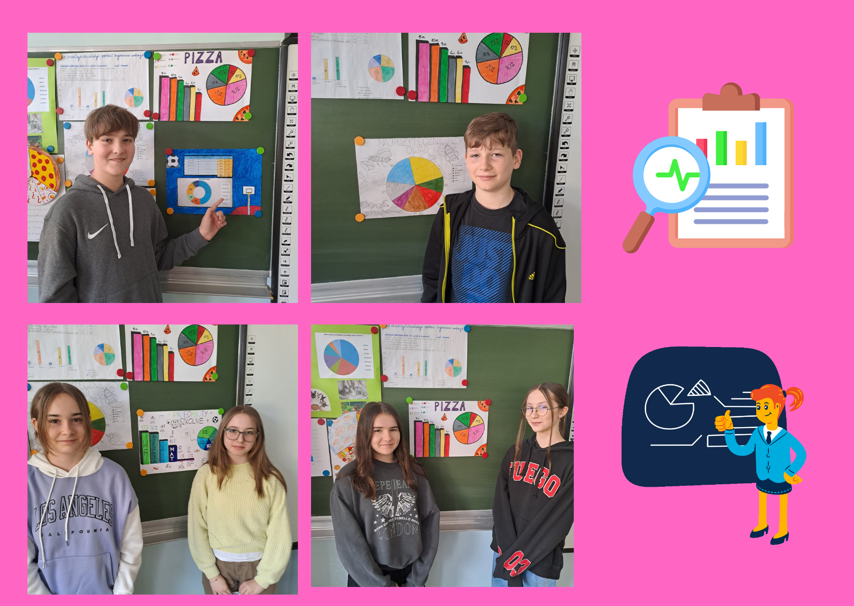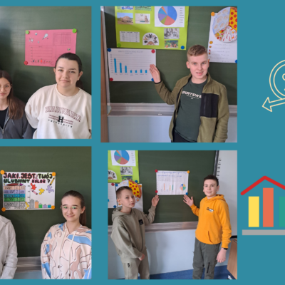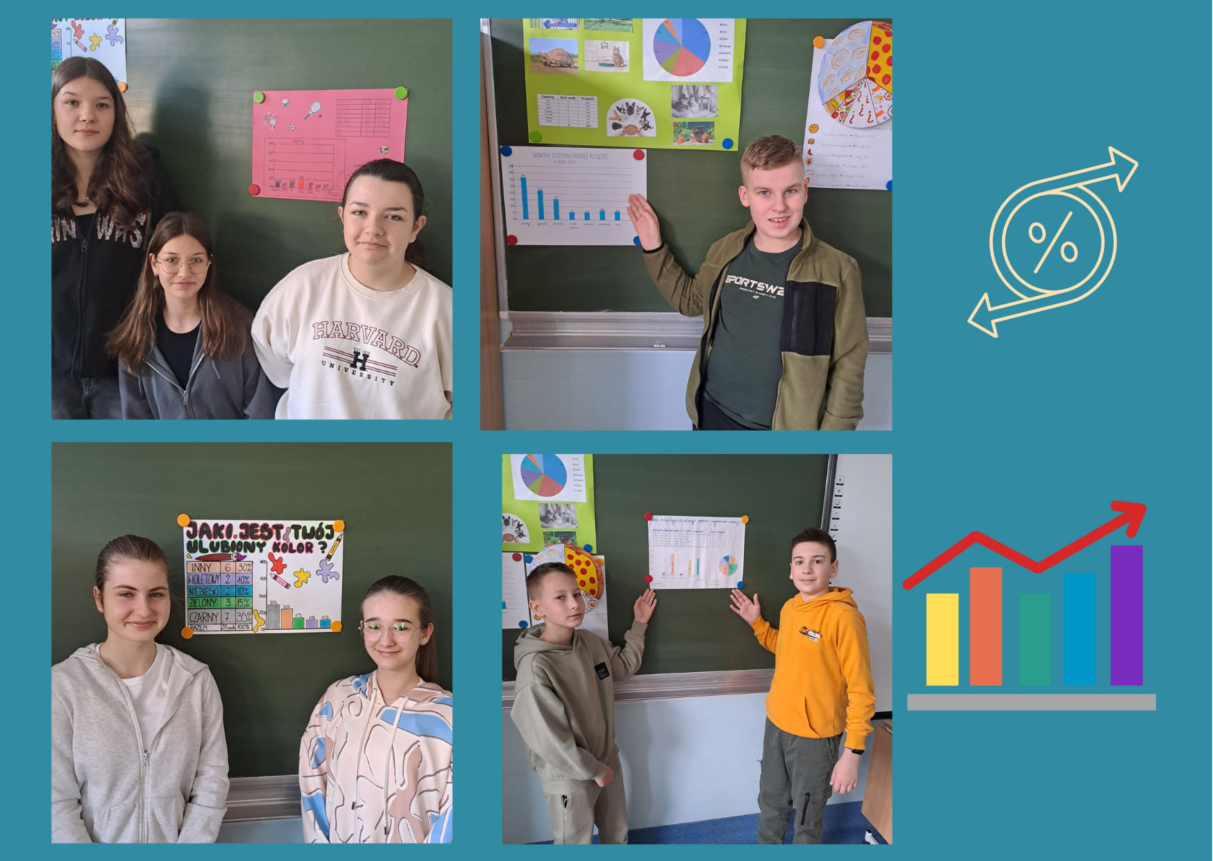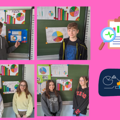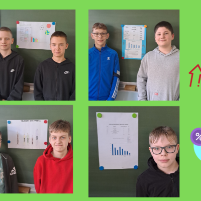W kwietniu uczniowie klas 6a i 6c realizowali projekt edukacyjny „Diagramy procentowe”. Celem projektu było rozwijanie umiejętności zbierania i opracowywania danych, przedstawianie zebranych danych w formie diagramów z wykorzystaniem procentów, analizowanie i wyciąganie wniosków. Zadaniem uczniów było opracowanie ankiety na dowolny temat oraz przeprowadzenie jej w wybranej grupie osób (np. uczniowie, pracownicy naszej szkoły, mieszkańcy Lubina). Wyniki ankiety uczniowie przedstawili na plakatach oraz omówili na forum klasy. Tematyka okazała się bardzo różnorodna np. „Jaki jest Twój ulubiony kolor?”, „Ulubiony owoc”, „Ulubiony sport”, Jaką kuchnię lubisz?”, „Ulubiona pizza”.