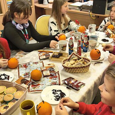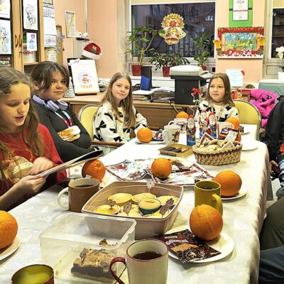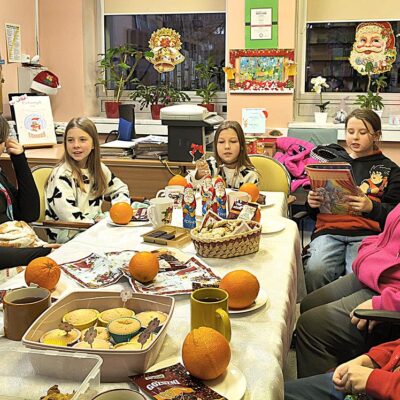 17 grudnia w bibliotece szkolnej odbyło się przedświąteczne spotkanie z grupą czytelników. Uczestnicy spotkania wspólnie czytali opowiadanie pt. „Opowieść wigilijna” na podstawie książki Charlesa Dickensa. Dzieci wykonały także kule zapachowe z pomarańczy i goździków. Nie zabrakło wspólnych rozmów, śpiewania świątecznych piosenek oraz słodkiego poczęstunku przy herbatce. Na zakończenie uczniowie otrzymali świąteczne zakładki do książek. Spotkanie upłynęło w radosnej i twórczej atmosferze, wprowadzając wszystkich w klimat zbliżających się Świąt.