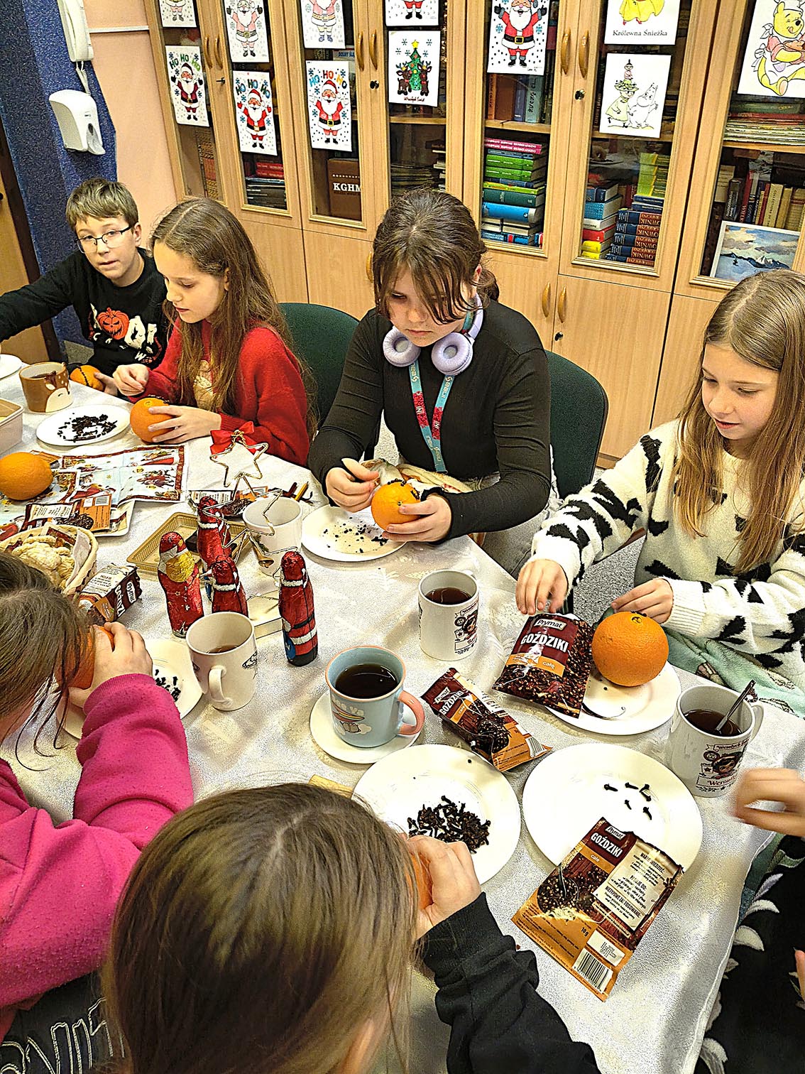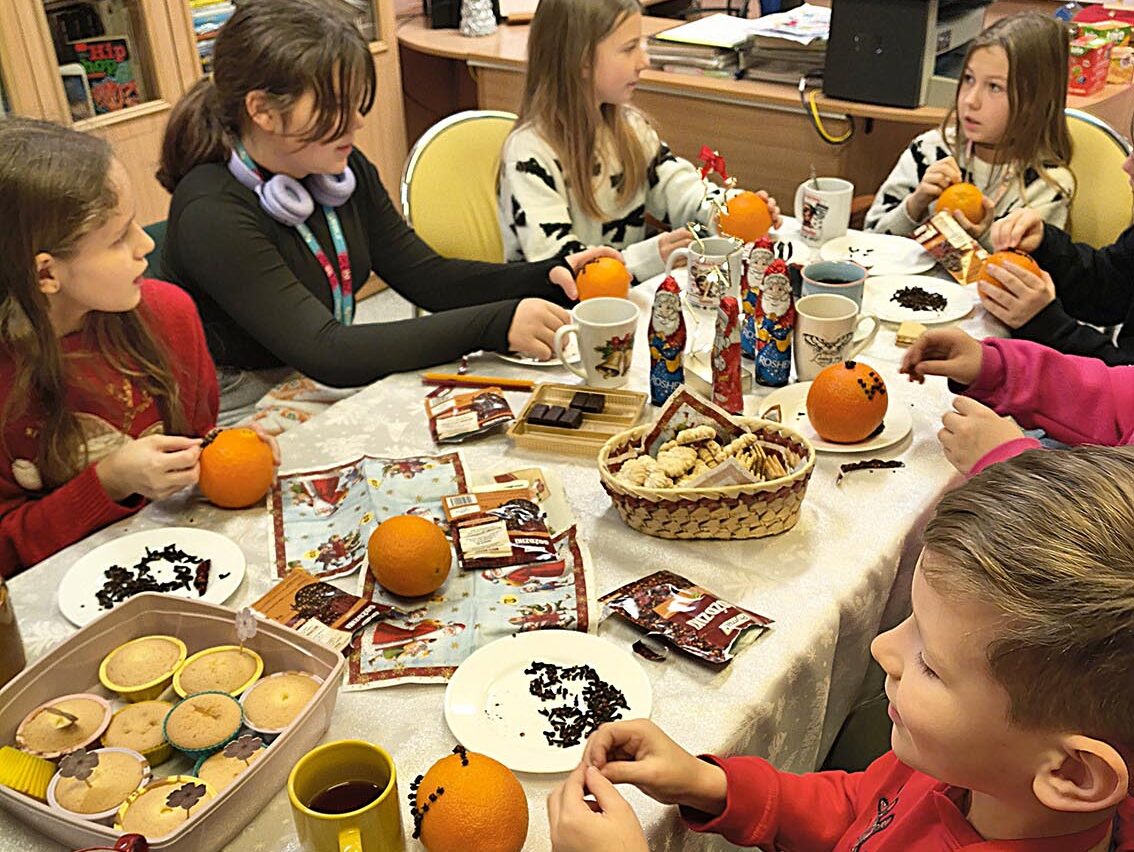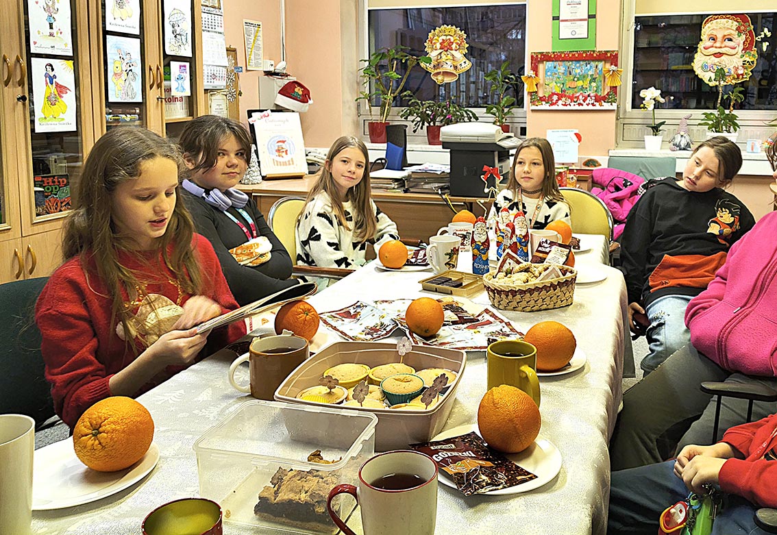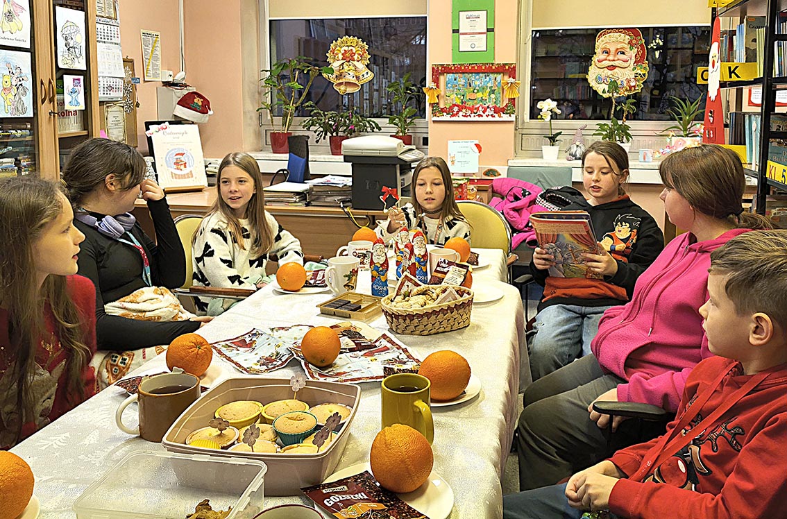 17 grudnia w bibliotece szkolnej odbyło się przedświąteczne spotkanie z grupą czytelników. Uczestnicy spotkania wspólnie czytali opowiadanie pt. „Opowieść wigilijna” na podstawie książki Charlesa Dickensa. Dzieci wykonały także kule zapachowe z pomarańczy i goździków. Nie zabrakło wspólnych rozmów, śpiewania świątecznych piosenek oraz słodkiego poczęstunku przy herbatce. Na zakończenie uczniowie otrzymali świąteczne zakładki do książek. Spotkanie upłynęło w radosnej i twórczej atmosferze, wprowadzając wszystkich w klimat zbliżających się Świąt.