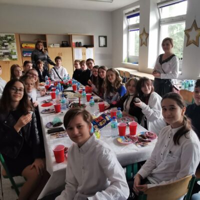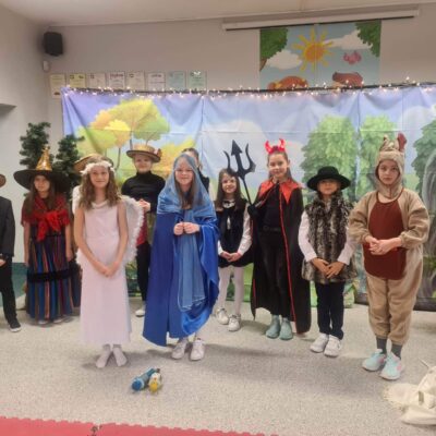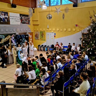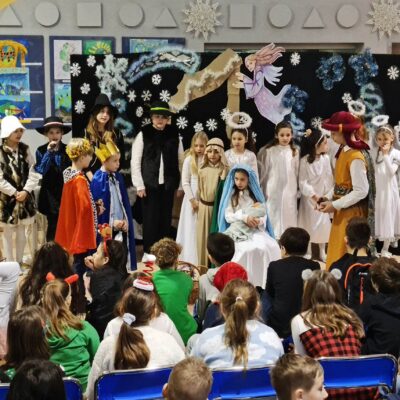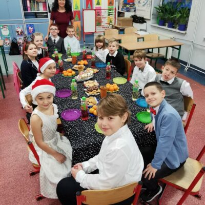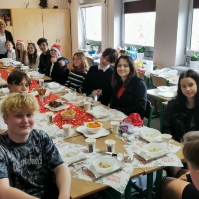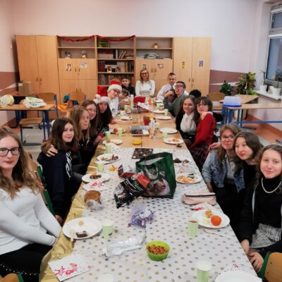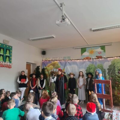 22 grudnia spotkaliśmy się po raz ostatni w starym 2022 roku. Klasy 1-3 obejrzały wesołe jasełka w świetlicy szkolnej, a klasy 4-8 oglądały przedstawienie w holu szkoły. Następnie wszyscy uczniowie spotkali się ze swoimi wychowawcami i nauczycielami w salach. Przy odświętnie przygotowanych stołach, wszyscy złożyli sobie świąteczne i noworoczne życzenia.