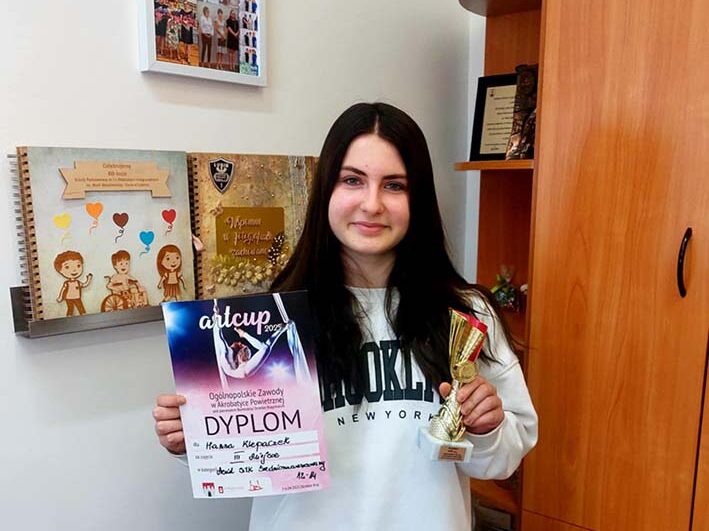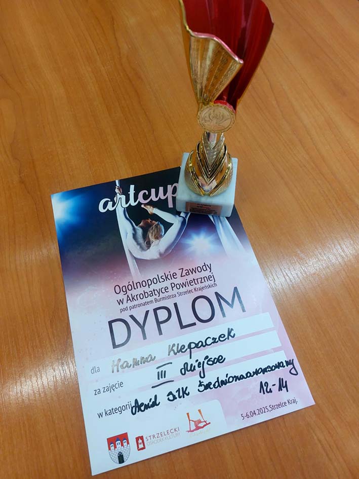 Z ogromną dumą informujemy, że Hanna Klepaczek, uczennica naszej szkoły, zajęła III miejsce w Ogólnopolskich Zawodach ArtCup w Akrobatyce Powietrznej, które odbyły się pod patronatem Burmistrza Strzelec Krajeńskich. Hania startowała w kategorii aerial silk – widowiskowej dyscyplinie łączącej taniec, siłę i grację w powietrzu, na długich, zwisających z sufitu szarfach. To wyjątkowe osiągnięcie jest efektem ciężkiej pracy, pasji i determinacji, jakie Hanna wkłada w treningi. Gratulujemy i życzymy dalszych sukcesów!