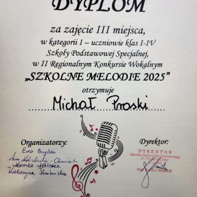 Z przyjemnością informujemy, że uczniowie naszej szkoły odnieśli wspaniałe sukcesy podczas II Regionalnego Konkursu Wokalnego „Szkolne Melodie 2025”, który odbył się 24 kwietnia w Specjalnym Ośrodku Szkolno-Wychowawczym im. Przyjaciół Dzieci w Lubinie.