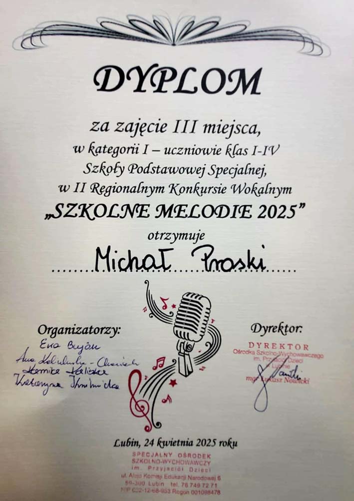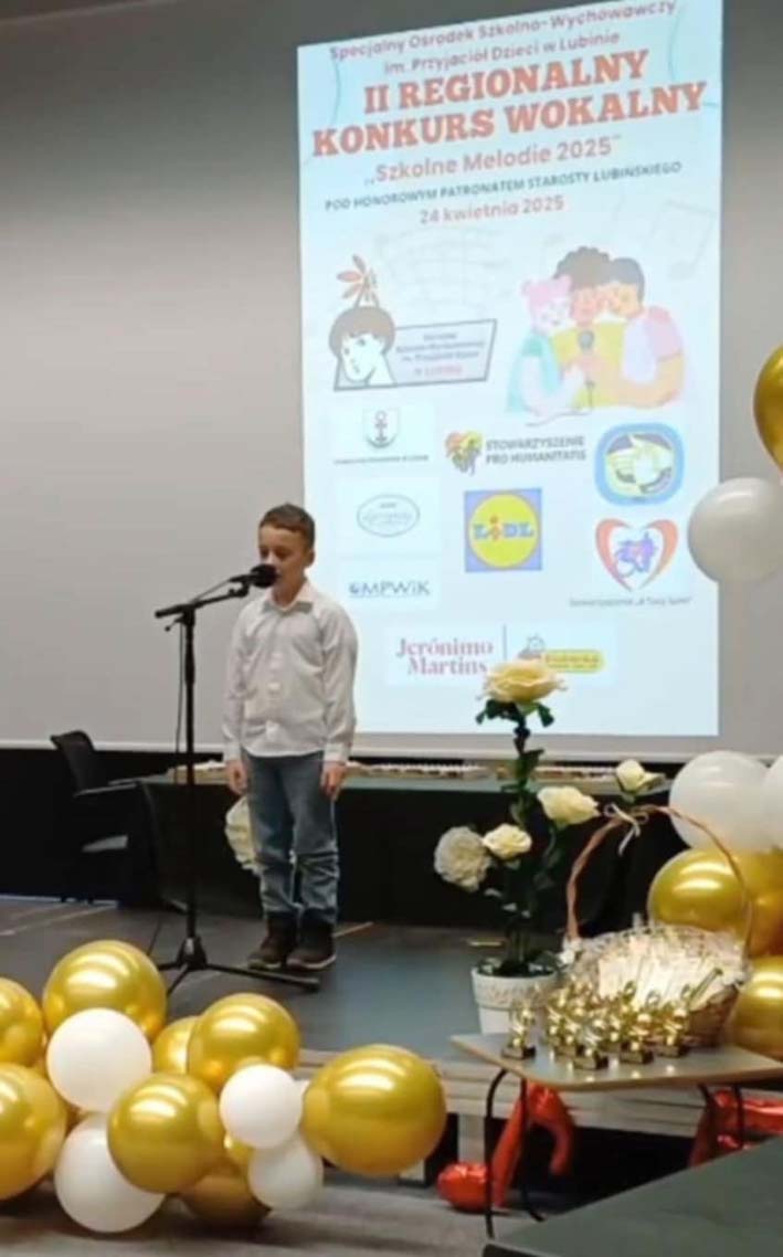 Z przyjemnością informujemy, że uczniowie naszej szkoły odnieśli wspaniałe sukcesy podczas II Regionalnego Konkursu Wokalnego „Szkolne Melodie 2025”, który odbył się 24 kwietnia w Specjalnym Ośrodku Szkolno-Wychowawczym im. Przyjaciół Dzieci w Lubinie.