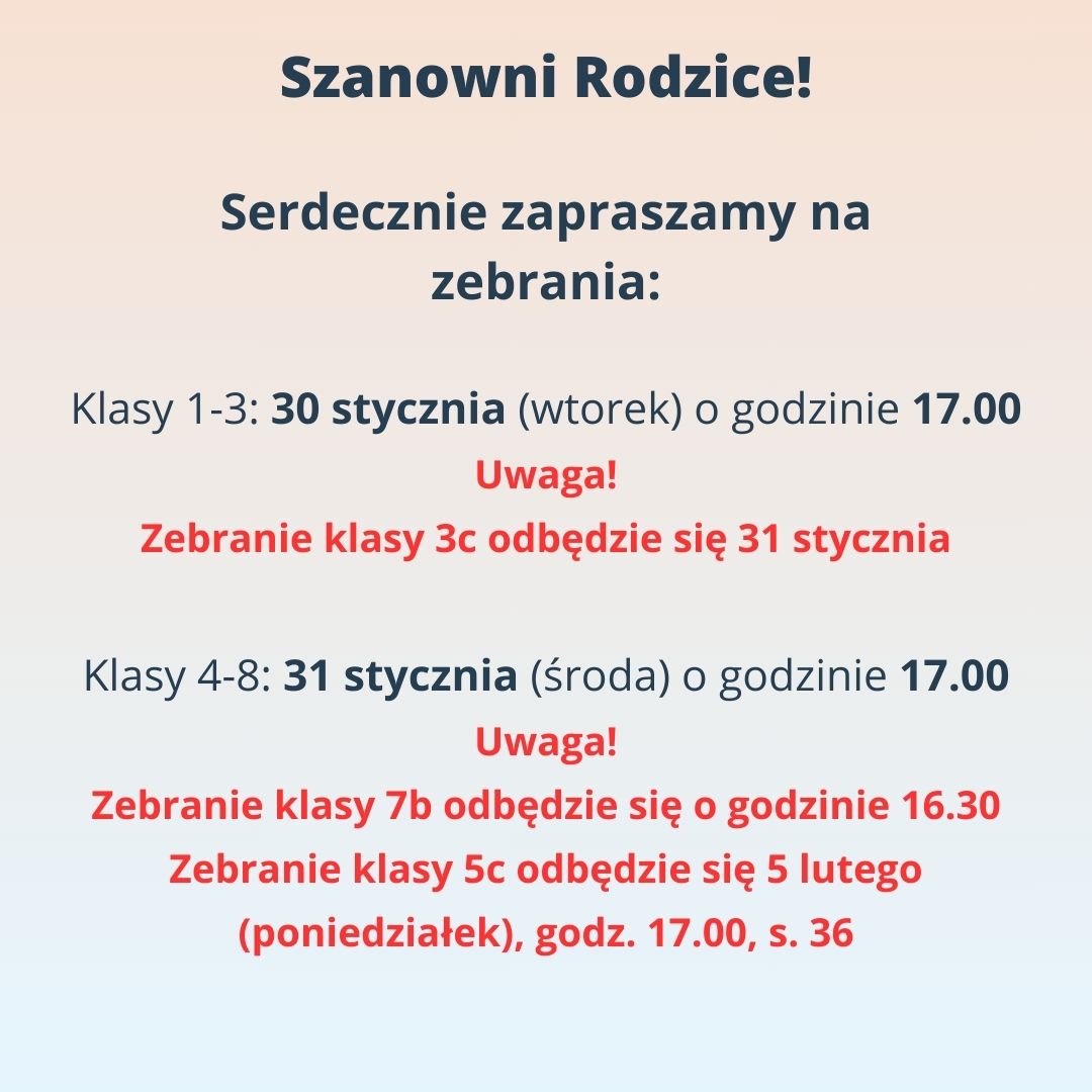 Zebrania z rodzicami Serdecznie zapraszamy na zebrania z rodzicami. Anna Gałka2024-01-30T13:32:39+01:0029 stycznia, 2024| Udostępnij FacebookTwitterLinkedInWhatsAppEmail